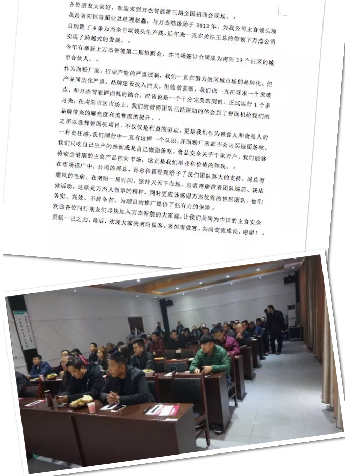 經(jīng)過午餐和簡單的茶歇,嘉賓們齊聚萬杰招商會現(xiàn)場,萬杰智能第三期全國招商大會正式開始。會上,首先由北京先行曾鵬飛為意向合伙人做萬杰智能鮮面機的項目介紹;然后由萬杰智能科技股份有限公司王曉杰董事長做“傳統(tǒng)還在,未來已來”主題報告;最后由來自南陽和新鄉(xiāng)的城市合伙人為意向合伙人分享市場心得和運營經(jīng)驗,涵蓋了從終端洽談、現(xiàn)場陳列、消費者溝通等眾多細節(jié),內(nèi)容豐富全面,引來現(xiàn)場不少嘉賓的共鳴。