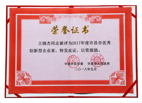 近日,萬杰智能董事長王曉杰榮獲2017年度“許昌市優秀創新型企業家”的榮譽稱號。這不僅是對王曉杰董事長在推動企業科技進步與創新發展做出的貢獻給予肯定。同時,也表現出許昌市政府對萬杰智能在2017年全市經濟社會發展的工作給予認可。此外,在許昌市企業家隊伍培養“十百千”行動計劃的通知中,王曉杰董事長又榮獲了2017年度優秀企業家的榮譽稱號。